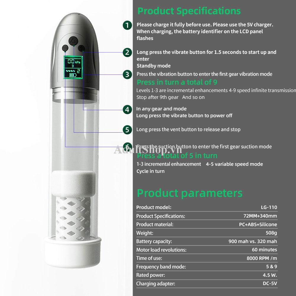 Louge LG-110 được chế tạo từ chất liệu cao cấp gồm ống nhựa PC trong suốt chịu lực tốt, miệng silicon mềm mại ôm khít dương vật, mang lại cảm giác thoải mái khi sử dụng. Thiết bị được trang bị bộ điều khiển điện tử với nhiều chế độ hút khác nhau, giúp người dùng tùy chỉnh lực hút phù hợp với cơ địa và mục tiêu luyện tập.